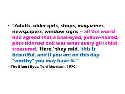 - 生活經驗(本人妹妹作為台灣小女孩也莫名的喜歡金髮娃娃,呼應Toni Morrison所寫的Beloved的劇情,即金髮碧眼等等特定的外型與審美已滲透至小孩心中)。